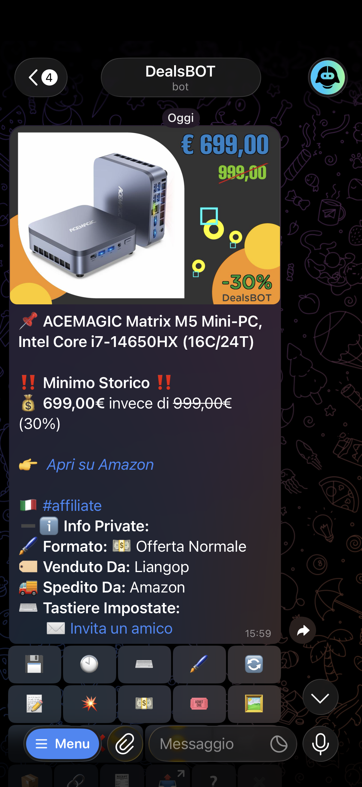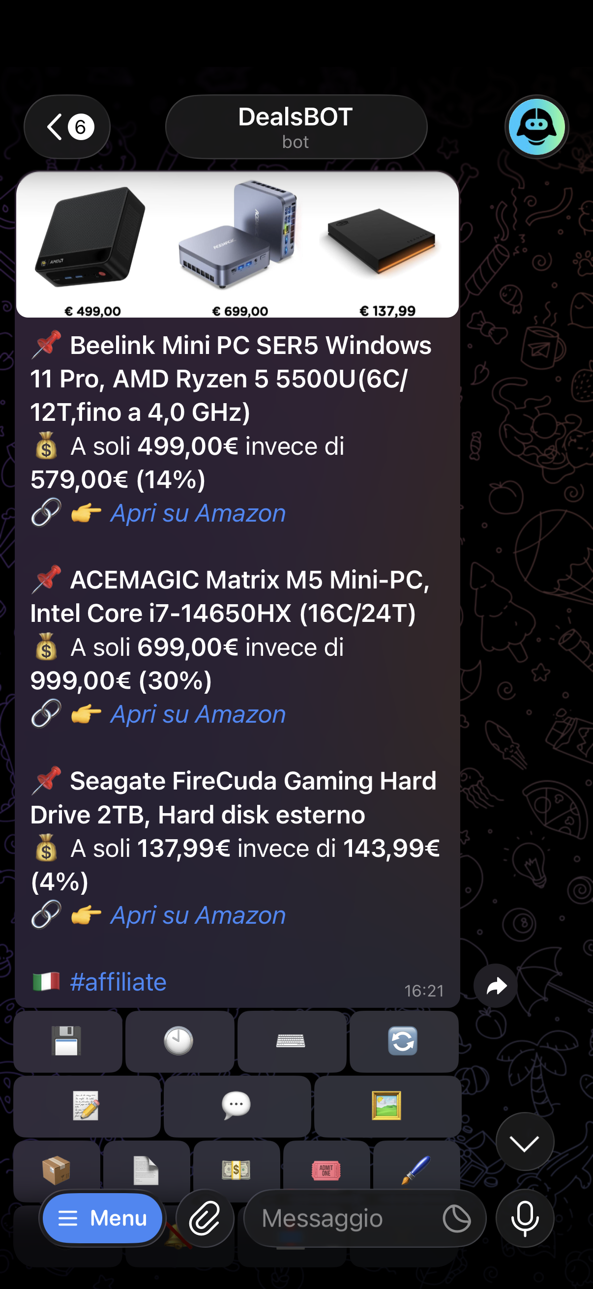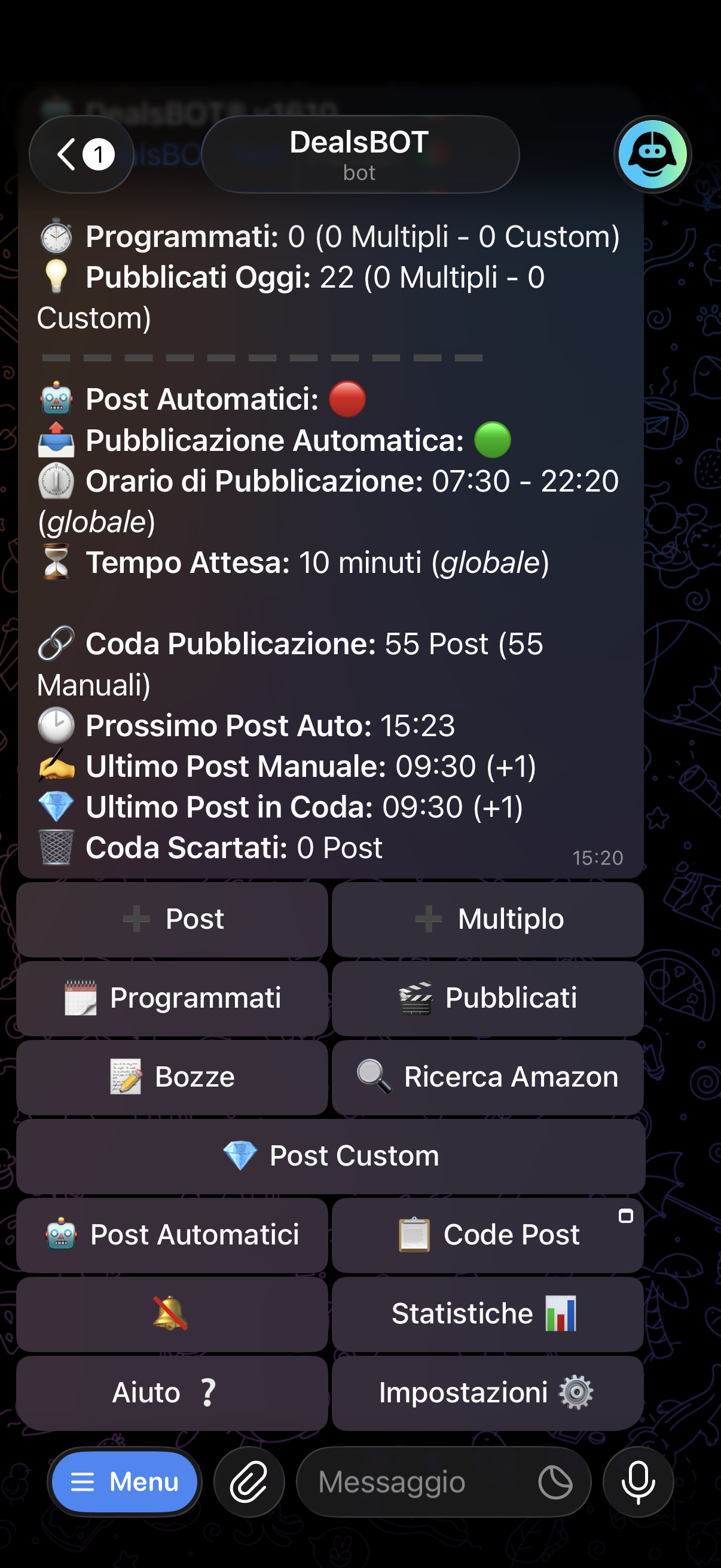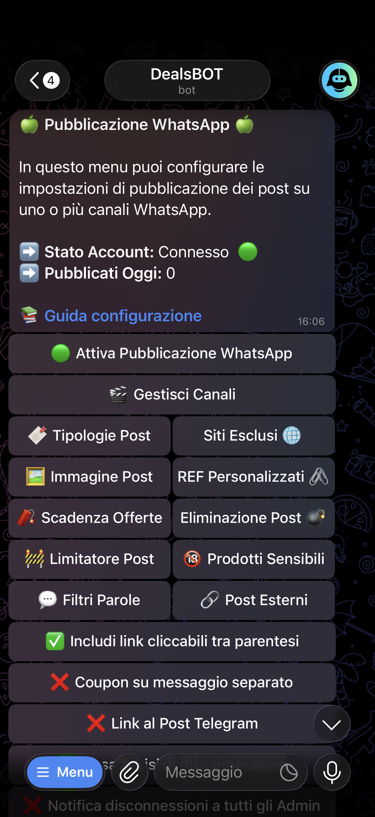 DealsBOT trova le offerte, inserisce il tuo ID affiliato e le pubblica in automatico su Telegram, WhatsApp, Facebook, X e Discord — mentre tu ti concentri sulla crescita del tuo business.