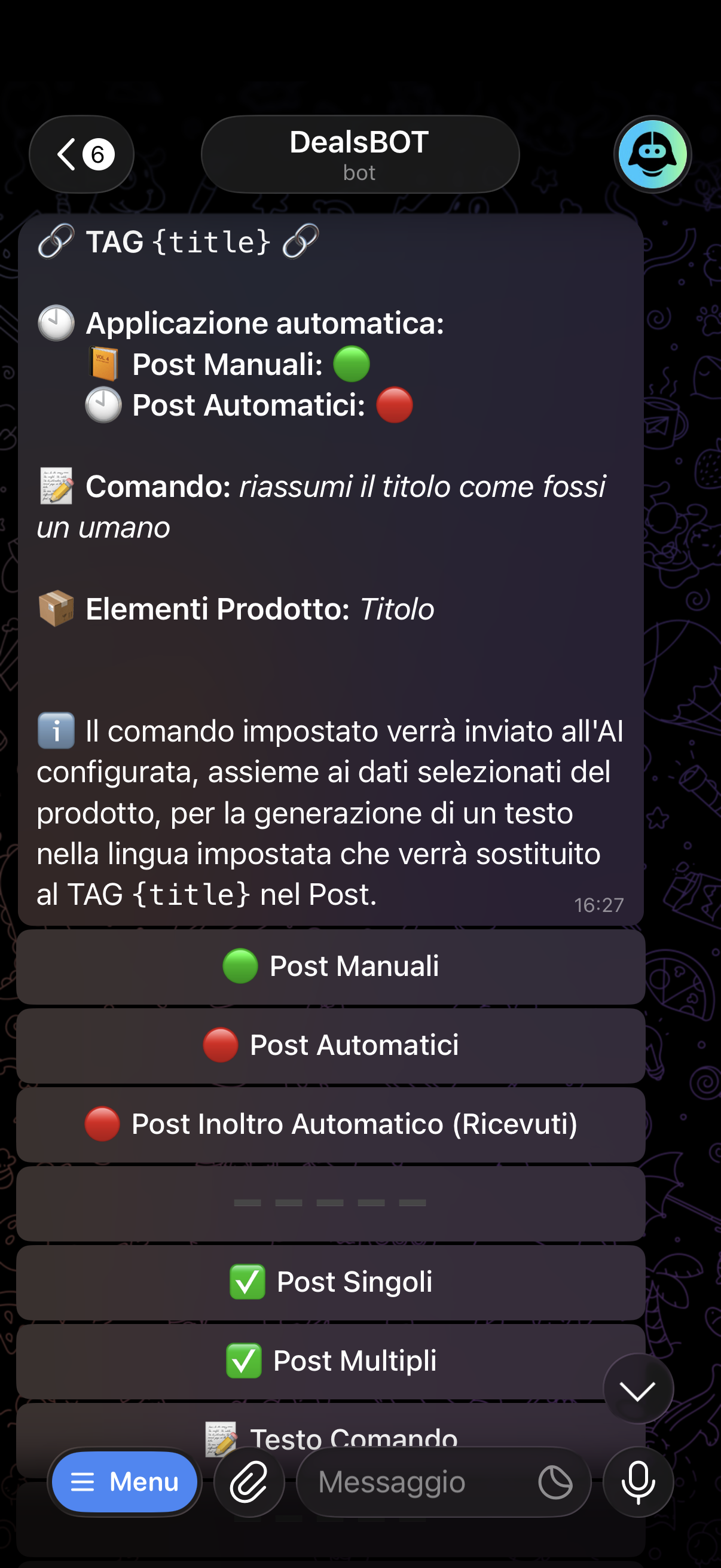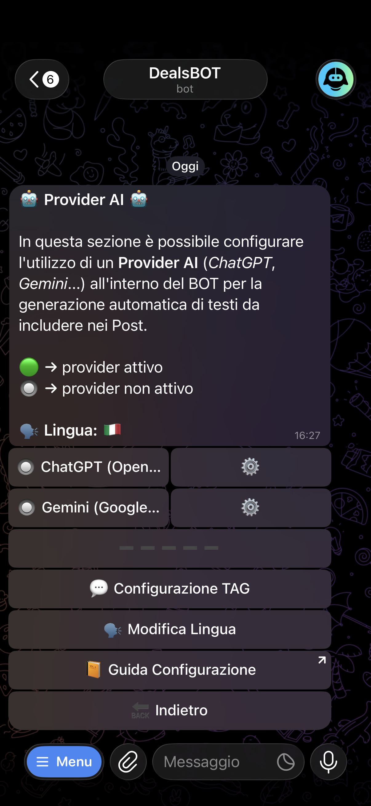 Collegando il BOT a OpenAI o Google Gemini, ogni post viene arricchito con testi ed emoji generati automaticamente in stile personalizzato.