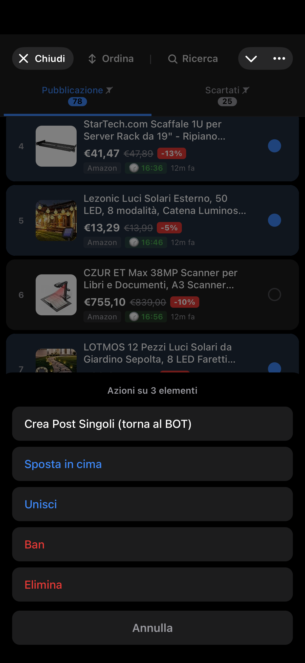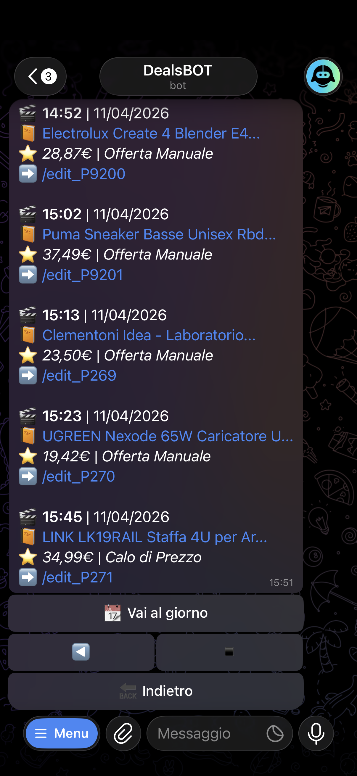 Visualizza le offerte in attesa di pubblicazione, modificale, riordinale o rimuovile direttamente dal bot — senza interrompere l'automazione.
