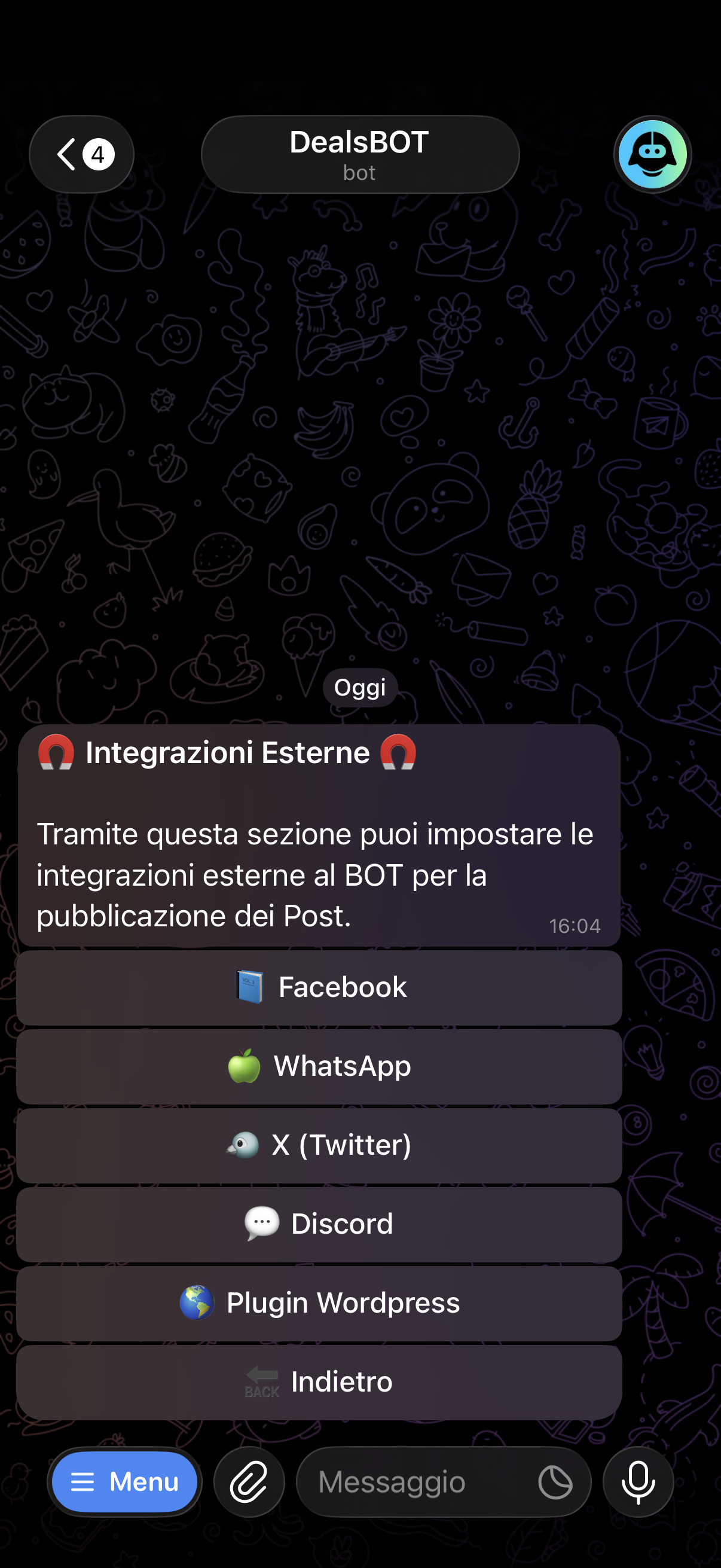 Apri Telegram, avvia il bot e collega i tuoi canali. Da lì puoi attivare le integrazioni per pubblicare anche su WhatsApp, Facebook, X e Discord. Nessuna installazione.