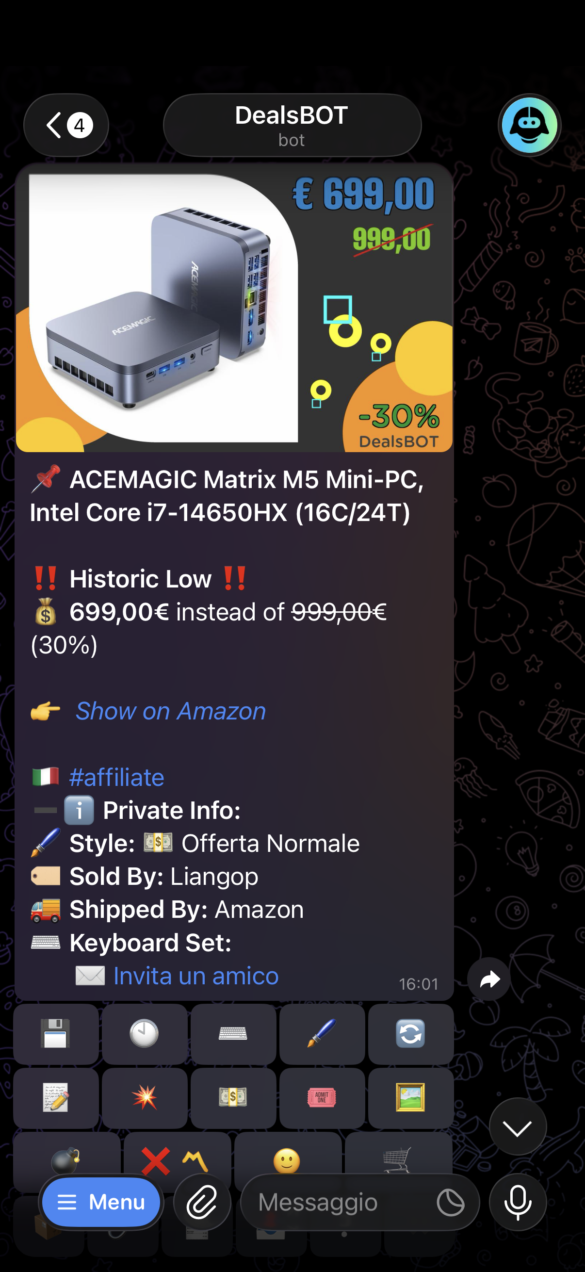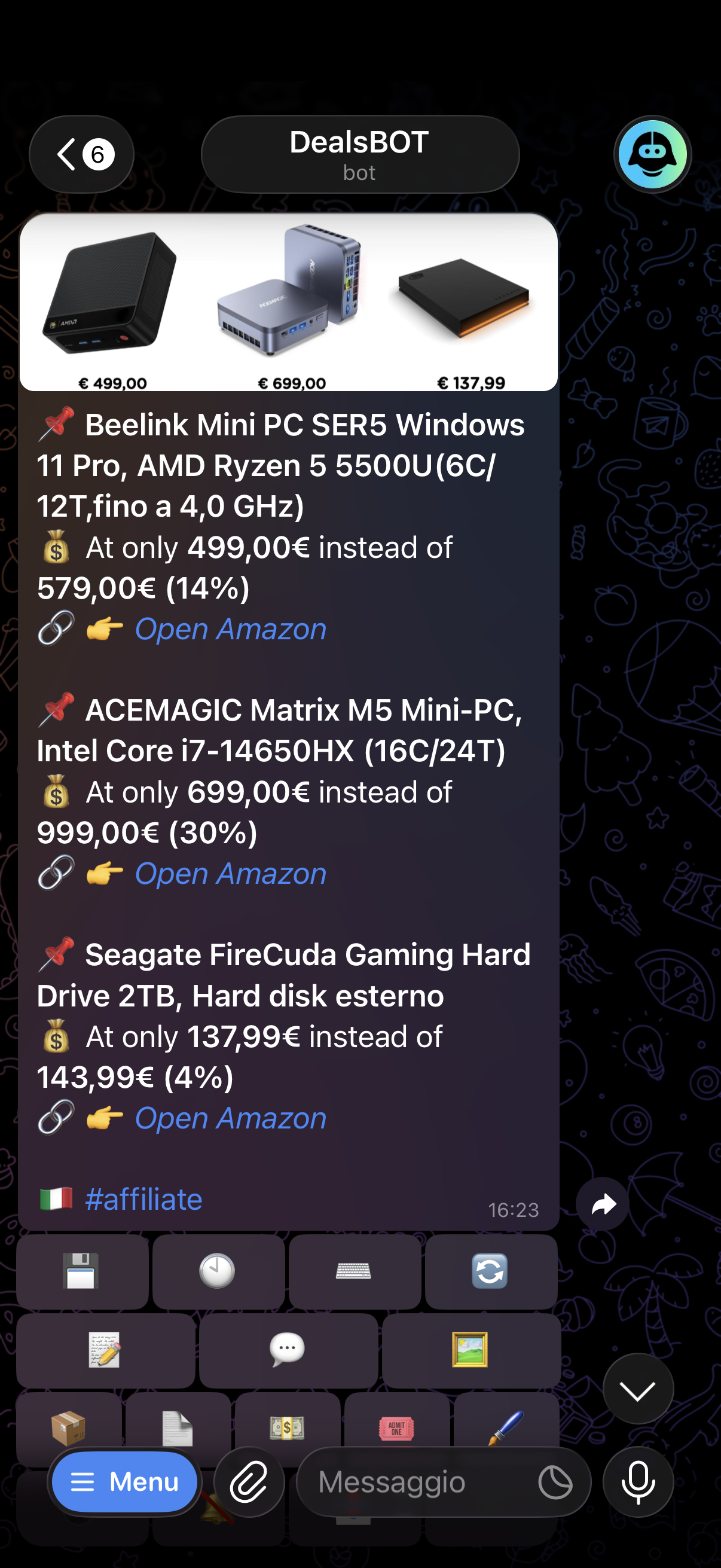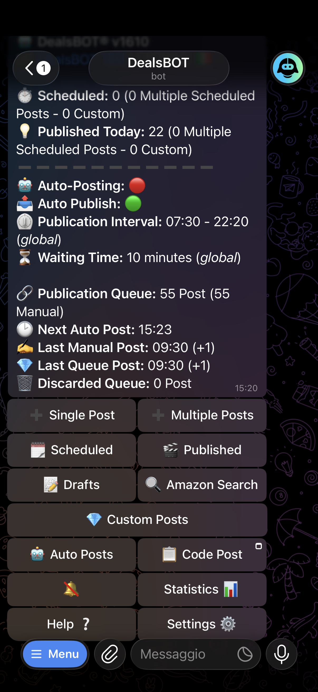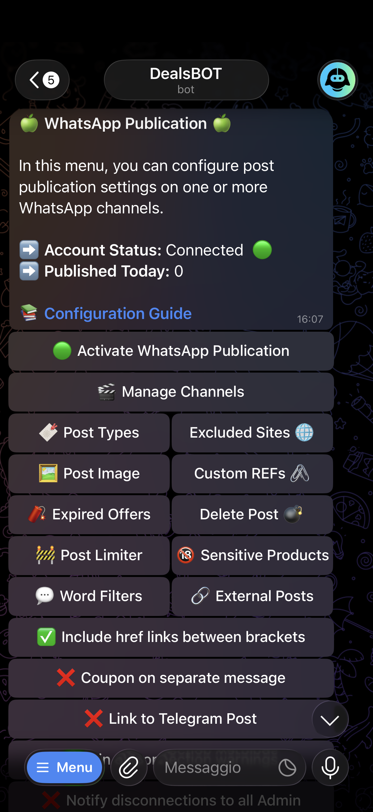 DealsBOT finds deals, inserts your affiliate ID and publishes them automatically on Telegram, WhatsApp, Facebook, X and Discord — while you focus on growing your business.