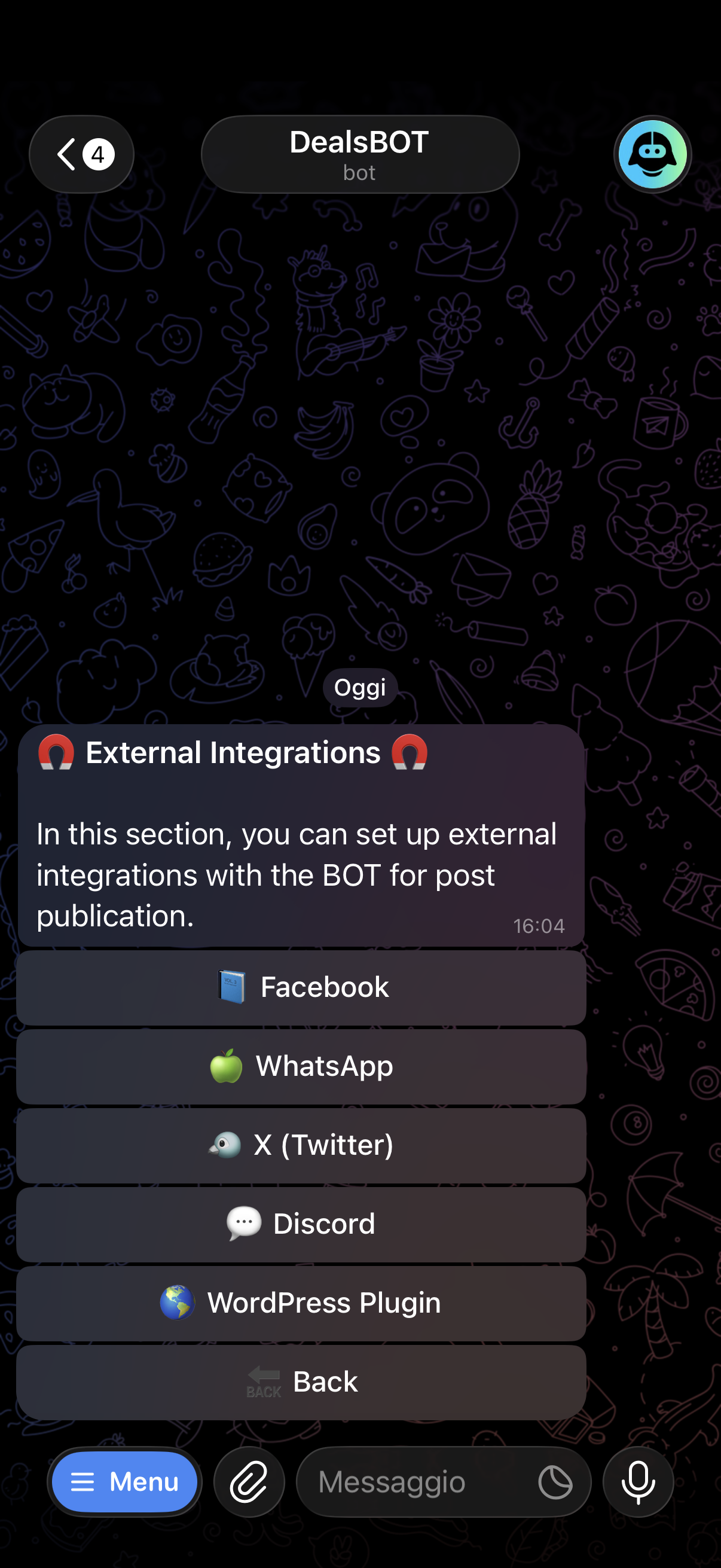 The bot also enables publishing on WhatsApp, Facebook, X and Discord — one tool for all your channels.